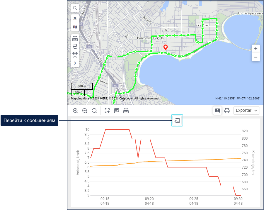 Если для учетной записи включена услуга Сообщения: Доступ к вкладке, то при щелчке по точке на графике соответствующее ей место на карте обозначается маркером.