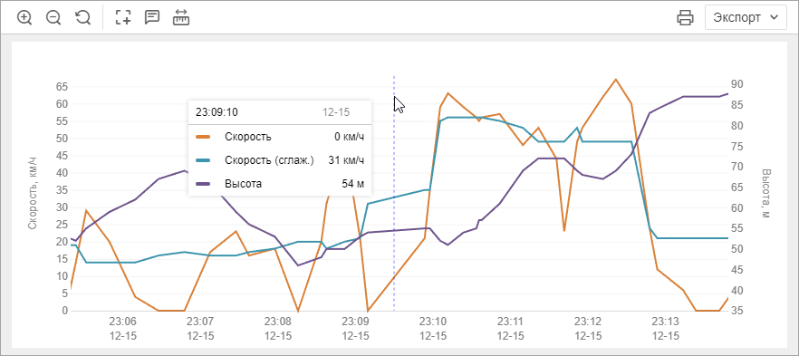 Показывать подробную информацию о точках. Щелкните по этой иконке, чтобы при наведении курсора на точки графика показывалась всплывающая подсказка с информацией из сообщения от объекта. Если в ней содержатся координаты, то при нажатии на них возможен переход на карту стороннего источника (см. подробнее здесь).В подсказке значения датчиков рассчитываются только по одному сообщению. Если для датчика или его валидатора используются данные из предыдущего сообщения, то в подсказке значение такого датчика будет показываться некорректно. Этот инструмент недоступен при использовании инструмента Сравнить данные. |