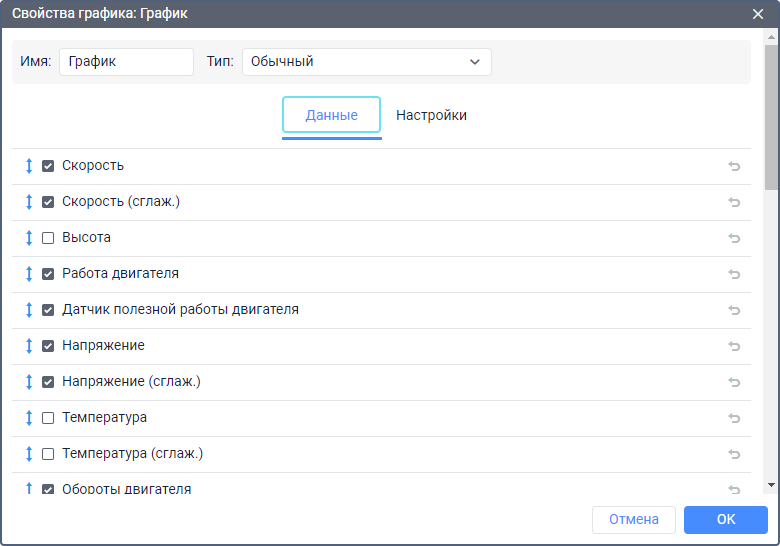В свойствах графиков доступно две вкладки: Данные и Настройки.