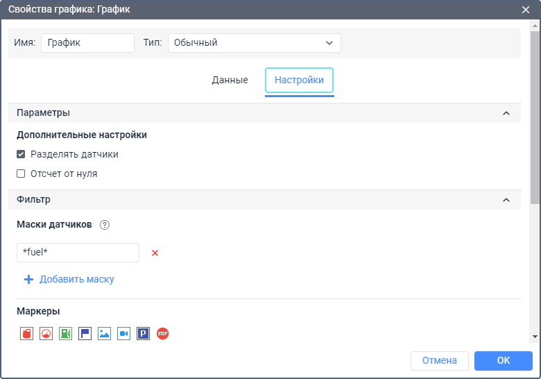 Эта настройка позволяет указать маркеры, которые должны показываться на графике. На нем могут показываться те же маркеры, что и на карте, кроме маркеров начальных и конечных положений и событий-нарушений.