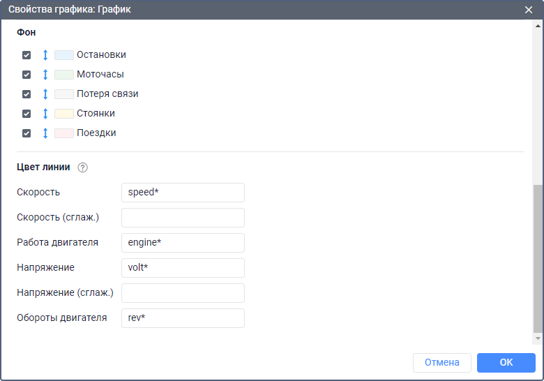 Фоном для графика могут служить интервалы некоторых событий: остановок, моточасов, потерь связи, стоянок, поездок. Это сделано для удобства сопоставления значения графика и интервала события, которому оно соответствует. Для интервалов событий могут быть назначены произвольные цвета. Для выбора цвета щелкните по цветовой ячейке, выберите нужный цвет из палитры и нажмите ОК.