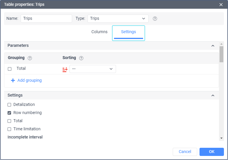 Для каждой таблицы, помимо выбора столбцов, доступны дополнительные настройки, расположенные на одноименной вкладке.