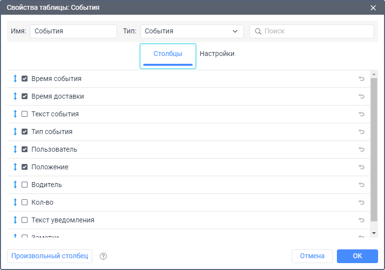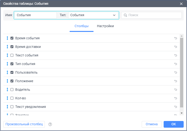 Набор доступных столбцов зависит от выбранного типа таблицы. Чтобы добавить столбец в таблицу, поставьте галочку слева от его имени. Чтобы добавить все столбцы одновременно, удерживайте нажатой клавишу Ctrl и отметьте любой столбец, который еще не выбран. Аналогичным способом можно отменить выбор всех столбцов. Для быстрого поиска столбцов воспользуйтесь динамическим фильтром в правом верхнем углу.