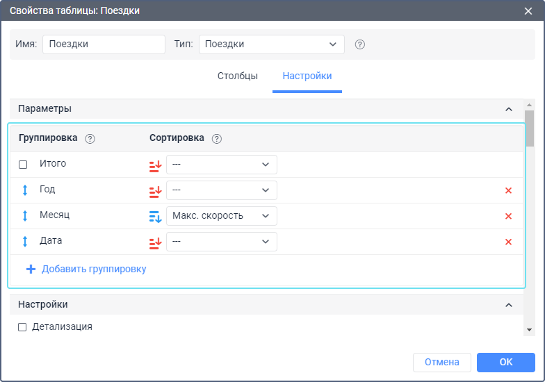Создаем отчет по поездкам. В этом отчете нас интересует максимальная скорость, длительность, пробег. Отмечаем данные столбцы. Кроме того, необходимо, чтобы информация была разбита по годам, месяцам и датам, а даты, в свою очередь, были отсортированы по максимальной скорости (от большей к меньшей).
