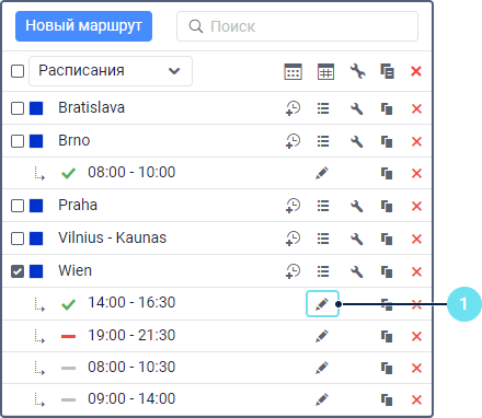 Впоследствии вы можете включать и выключать автоматическое создание рейсов с помощью иконки / рядом с именем расписания.Рейсы создаются автоматически, когда до запланированного времени прибытия в первую контрольную точку остается количество минут, указанное в поле отклонения. Если указано несколько объектов, то на рейс назначается тот, который первым покидает геозону начальной точки маршрута, независимо от выбранного порядка прохождения точек. |