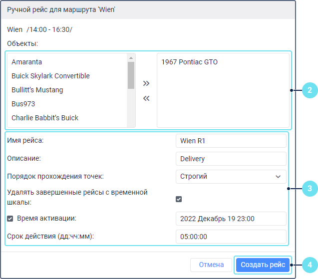 Вы также можете удалять рейсы с временной шкалы вручную в списке рейсов.Время активации Время, когда рейс должен начать отслеживаться. Если оно не указано, началом рейса считается вход в первую точку (если выбран строгий порядок прохождения точек) или в любую точку (в остальных случаях). Срок действия* Время (дни:часы:минуты), по истечении которого рейс должен принудительно завершиться и получить статус прерванного. Это время отсчитывается от времени активации рейса. По умолчанию срок действия равен суткам. -