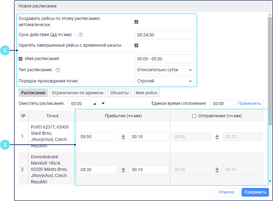 Чтобы установить одинаковое отклонение от времени прибытия и отправления для всех контрольных точек сразу, заполните поле Единое время отклонения и нажмите на Применить.