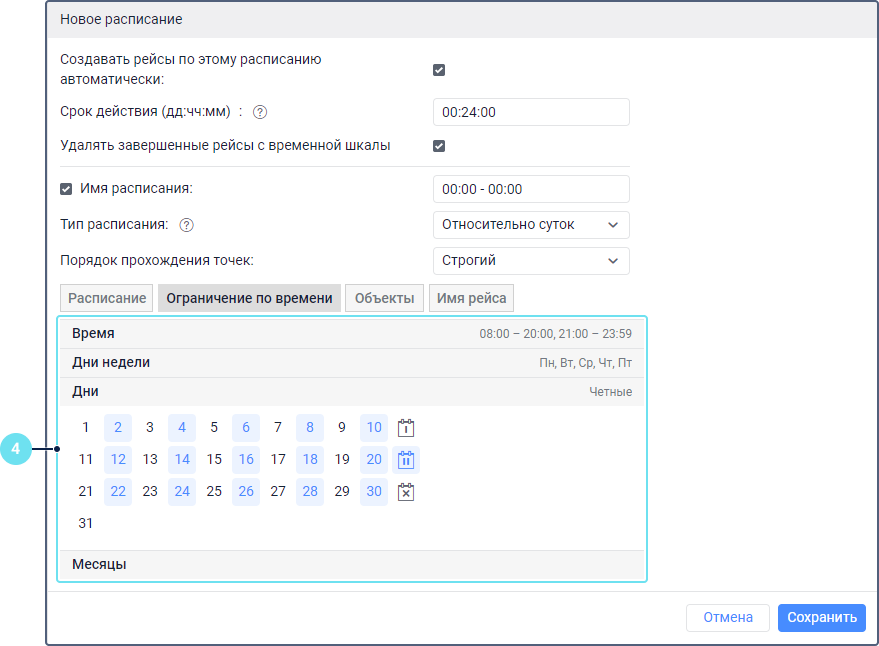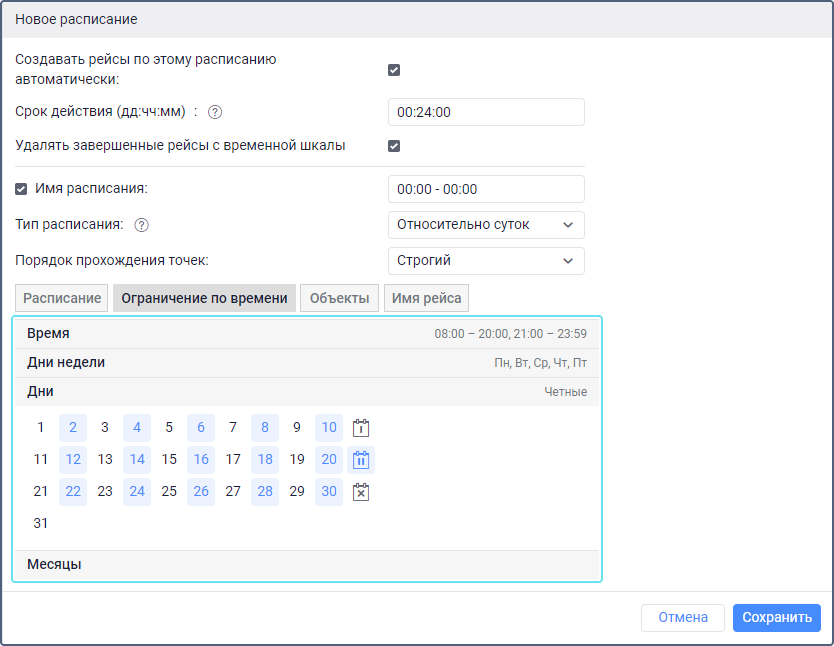 | Относительно суток | Расписание этого типа может применяться в разные дни, так как время прохождения контрольных точек указывается в нем относительно суток, т. е. отсчитывается от 00:00. Рейсы по такому расписанию могут создаваться вручную и автоматически. |