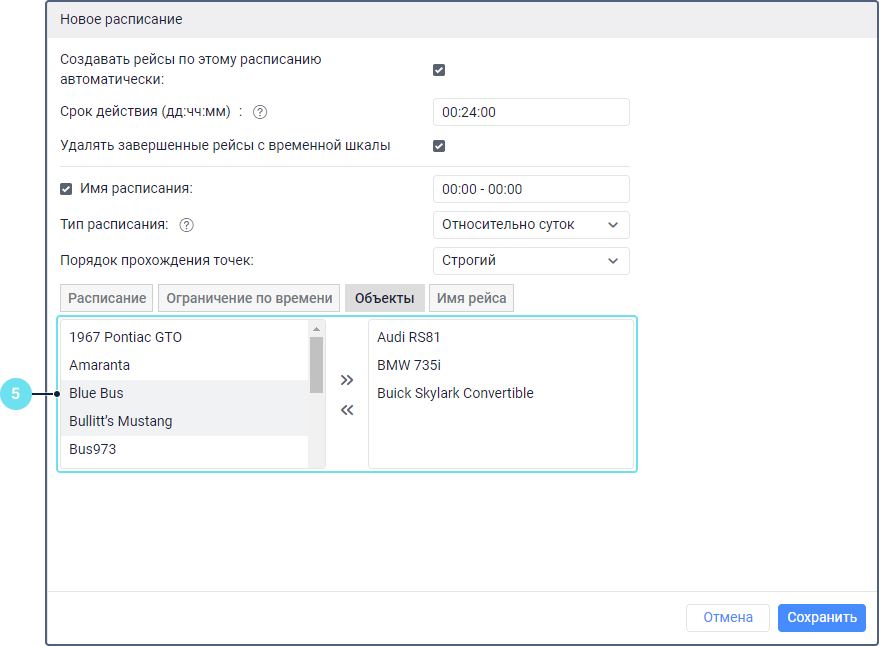На вкладке Объекты выберите объекты, которые должны назначаться на рейсы по этому расписанию, если включено автоматическое создание рейсов.