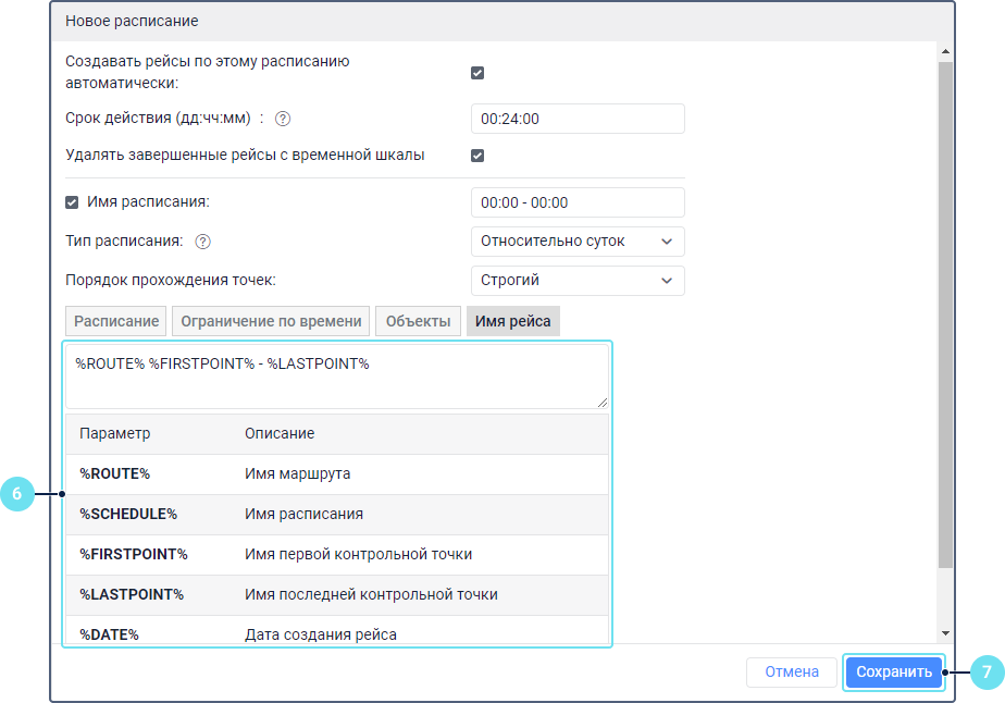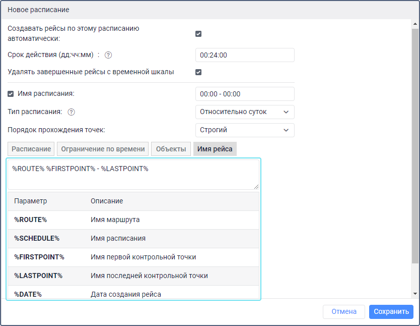 По умолчанию при автоматическом создании рейсов используется следующий формат имени: %ROUTE% %FIRSTPOINT% - %LASTPOINT%.