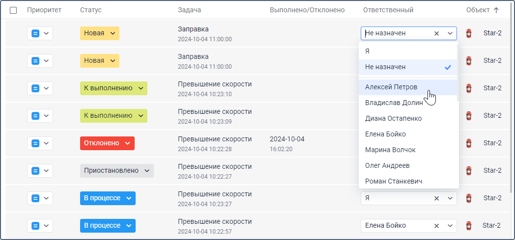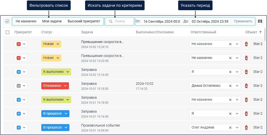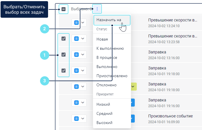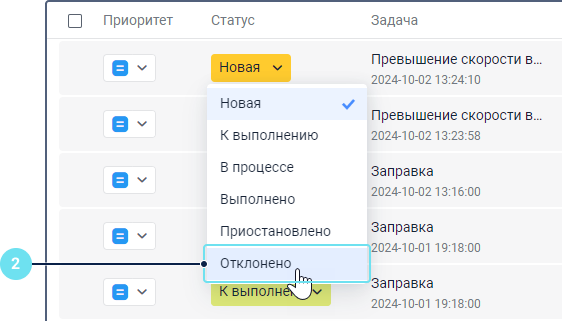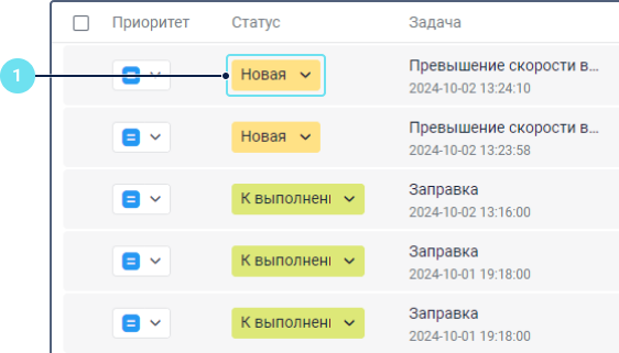 После регистрации события задача появляется в списке задач со статусом Новая. Вы можете изменить статус одной задачи или нескольких задач сразу.