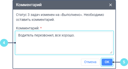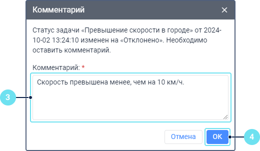 Если вы выбрали статус Выполнено, Приостановлено или Отклонено, оставьте комментарий. Комментарии также обязательны при изменении статуса задачи с Выполнено или Отклонено на любой другой статус. Максимальная длина комментария — 50 символов.