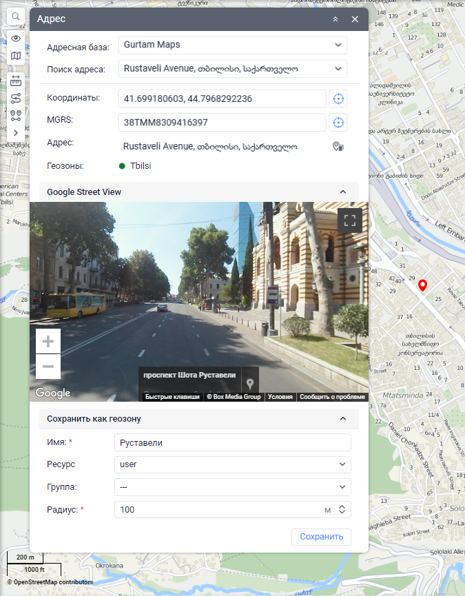 - Панорамные снимки найденного места при наличии ключей Google или Regional. Для этого необходимо развернуть блок Google Street View или Regional Panorama в окне инструмента.