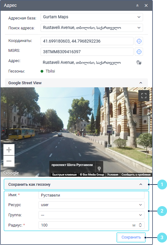 Этот инструмент предназначен для поиска мест на карте и определения адреса точек. Он также позволяет сохранить отмеченное место в качестве геозоны.