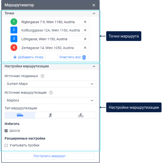 - указывать такие основные и дополнительные настройки, как источник геоданных и маршрутизации, способ передвижения, характеристики грузового транспорта и т. д.;