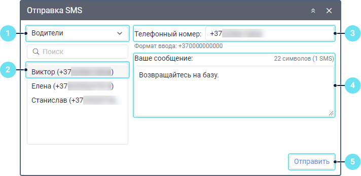 Инструмент SMS позволяет отправлять SMS-сообщения водителям, на объекты или на произвольные телефонные номера. Чтобы его открыть, нажмите на иконку