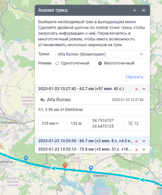 - Выберите режим анализа трека: одноточечный или многоточечный. Многоточечный режим позволяет видеть в окне инструмента информацию о нескольких точках. В одноточечном при выборе новой точки удаляется информация о предыдущей.