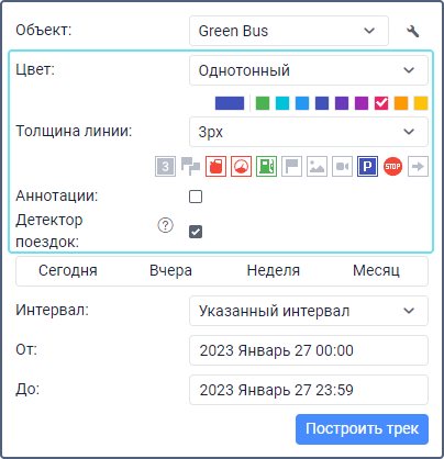 К параметрам треков относятся цвет, толщина линии, маркеры, опции Аннотации и Детектор поездок. Параметры трека указываются до его построения. Когда трек нанесен на карту, изменить параметры нельзя.