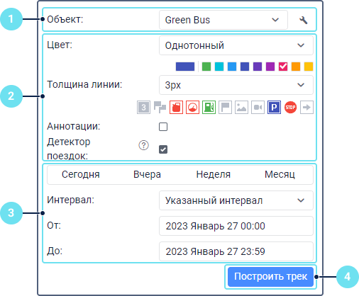 - Укажите временной интервал, за который необходимо построить трек. Принцип выбора временнóго интервала такой же, как в отчетах.
