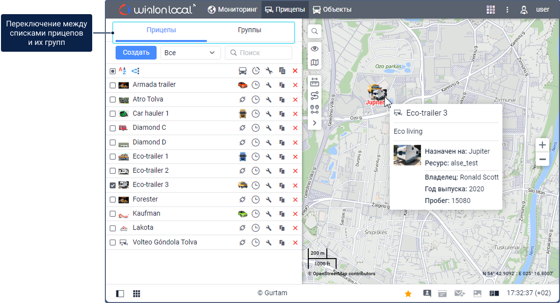 Для работы с прицепами щелкните по вкладке Прицепы в верхней панели или выберите одноименный пункт в окне настройки главного меню. Вы можете работать как с прицепами, так и с их группами.