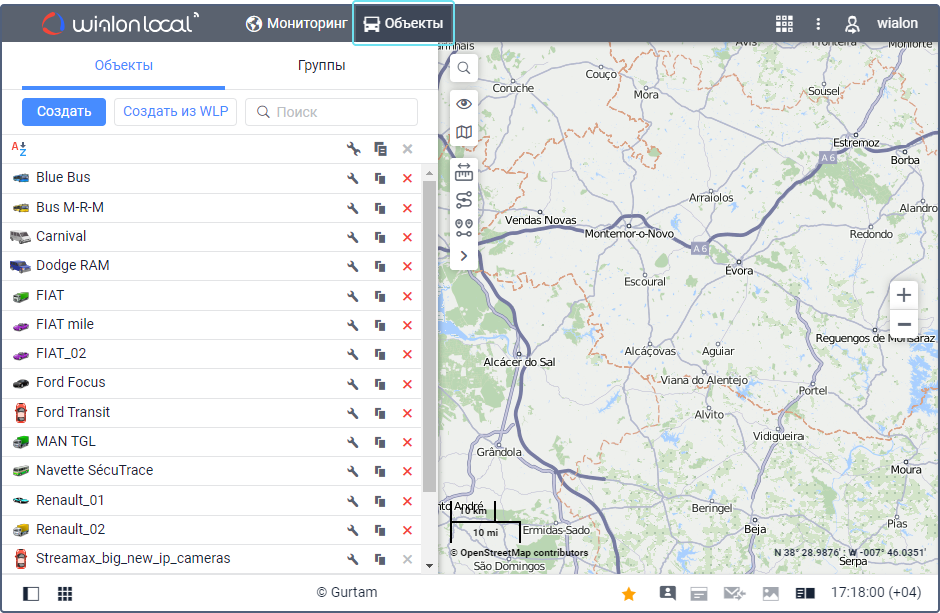 На вкладке Объекты создаются объекты и группы объектов, за которыми впоследствии можно следить на вкладке Мониторинг. На вкладке работает динамический поиск по имени объекта. Также здесь можно выполнять следующие действия с объектами: отправка SMS, редактирование свойств, копирование и удаление.
