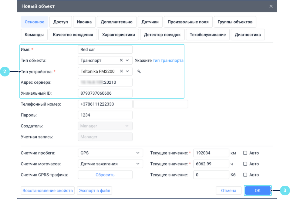 Укажите свойства объекта. Для подключения объекта к системе необходимо заполнить как минимум следующие поля на вкладке Основное: