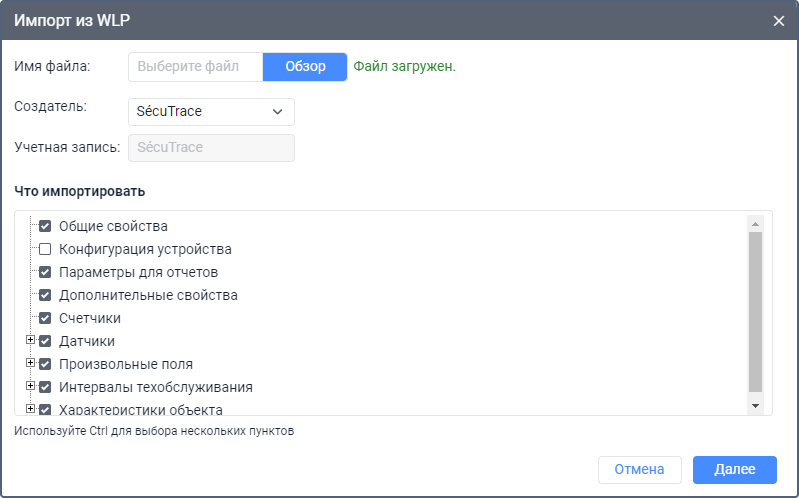 Если у вас есть файл WLP с сохраненными свойствами объекта, то вы можете создать объект с ужé настроенными свойствами. Для этого нажмите на кнопку Создать из WLP, выберите файл и параметры, которые вы хотите добавить в свойства объекта, и нажмите Далее.