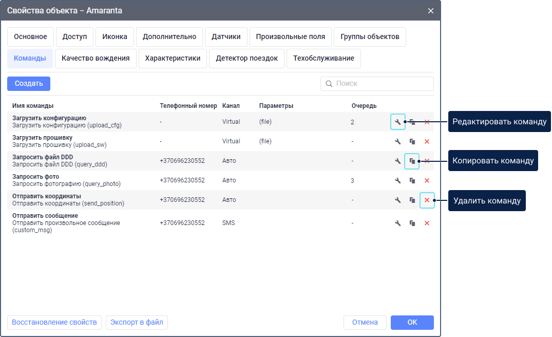С командами можно выполнять следующие действия: очистка очереди, редактирование, копирование, удаление, отправка. Первые четыре действия доступны непосредственно в списке команд в свойствах объекта.