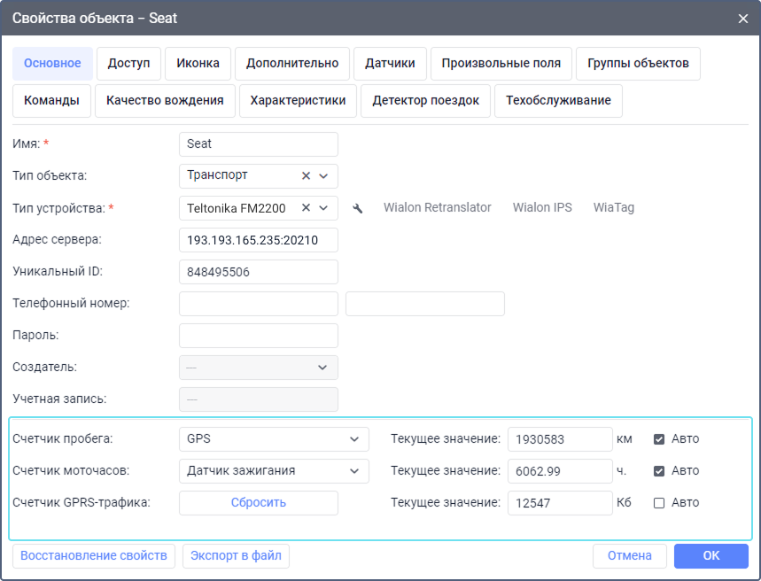 На вкладке Основное, кроме прочих свойств, вы можете настроить счётчики пробега, моточасов и трафика GPRS.