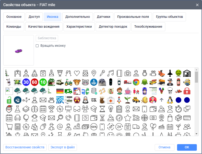 На этой вкладке свойств объекта вы можете выбрать иконку, которая используется для обозначения объекта на карте и в списках объектов.