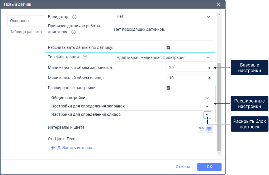 Датчик уровня топлива имеет дополнительные настройки, которые показываются при активации опции Рассчитывать данные по датчику и делятся на базовые и расширенные.