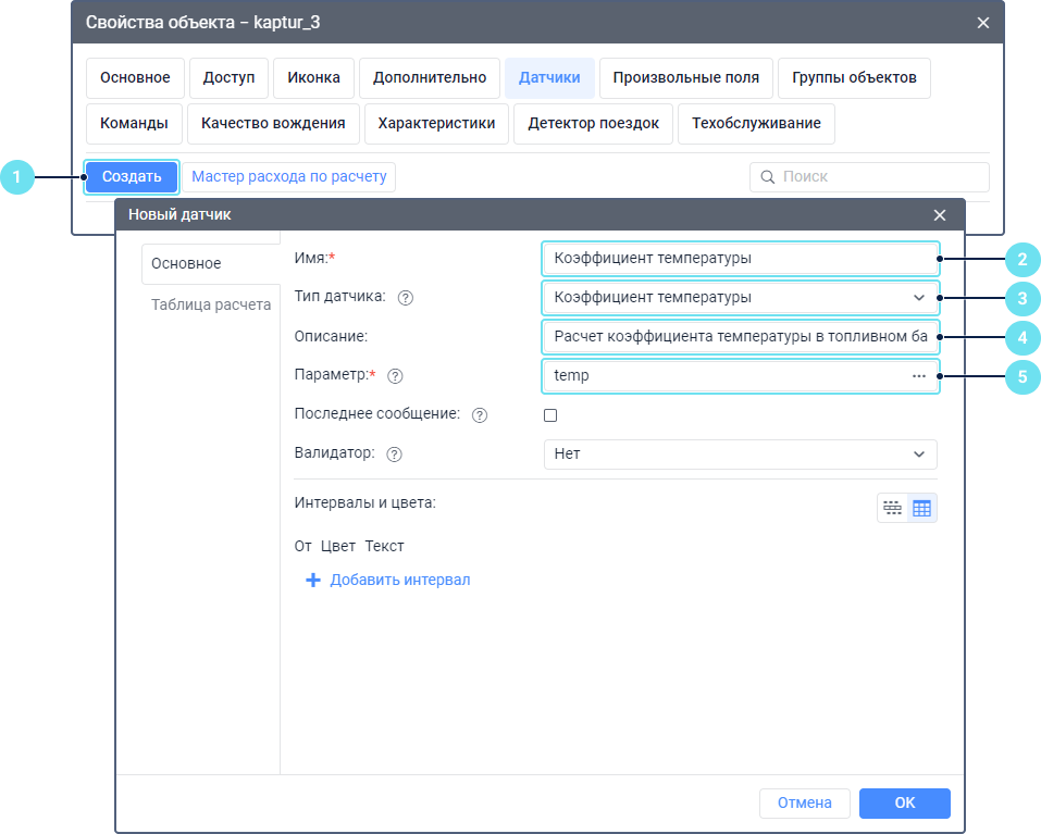 Любая жидкость может сжиматься или расширяться при разной температуре, поэтому показания датчика уровня топлива могут быть недостаточно точными без учета температуры в топливном баке или, например, в цистерне. В таком случае, для получения более точных вычислений уровня топлива необходимо также создать датчик типа Коэффициент температуры. Он позволяет рассчитать коэффициент температуры на основе параметра, в котором приходят данные о температуре или напряжении.