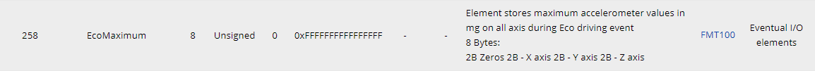 На примере устройства Teltonika FMT100 рассмотрим случай, когда в параметре io_258 регистрируются значения акселерометра по трем осям при превышении значений, заданных в устройстве. Данные этого параметра удобно использовать для работы с приложением Eco Driving. В Wialon данные регистрируются в виде io_258=932034904003. Необходимо привести значения к g.