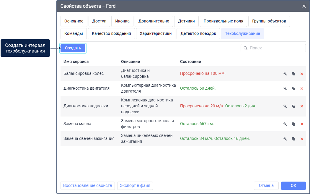 Для выполнения действий с интервалами техобслуживания используйте иконки в конце каждой строки.