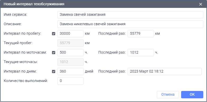 При указании всех интервалов одновременно срок каждого из них отсчитывается отдельно. Например, срок выполнения сервиса может быть просрочен по пробегу или моточасам, но при этом не просрочен по дням.