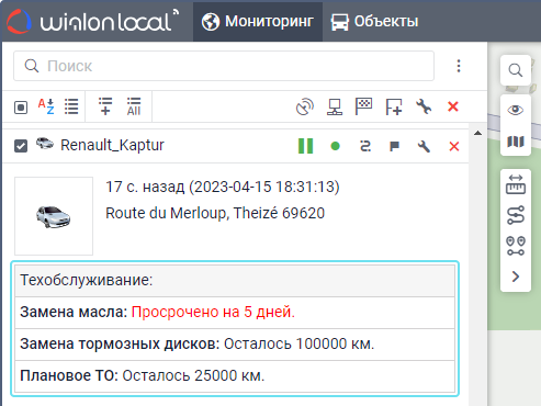 Созданные интервалы техобслуживания и состояние их выполнения могут показываться во всплывающей подсказке к объекту и в расширенной информации об объекте на вкладке Мониторинг.