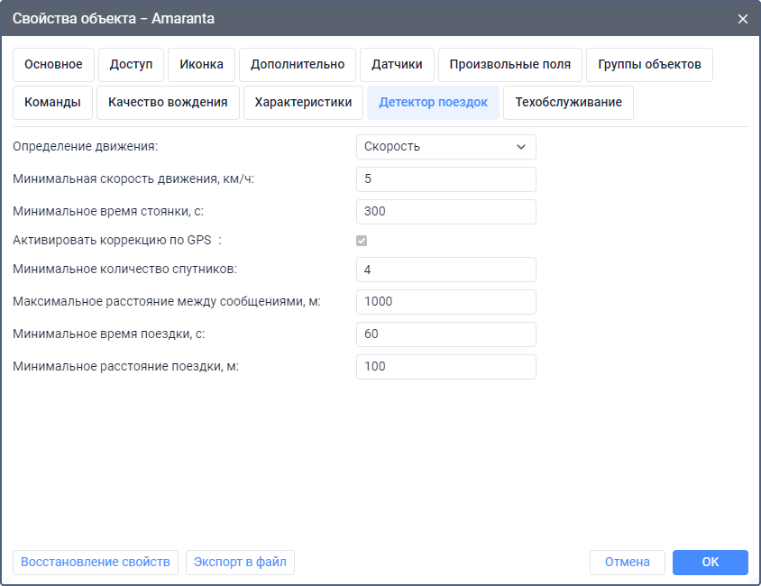 Параметры детектора поездок используются для определения интервалов движения, поездок, остановок и стоянок.