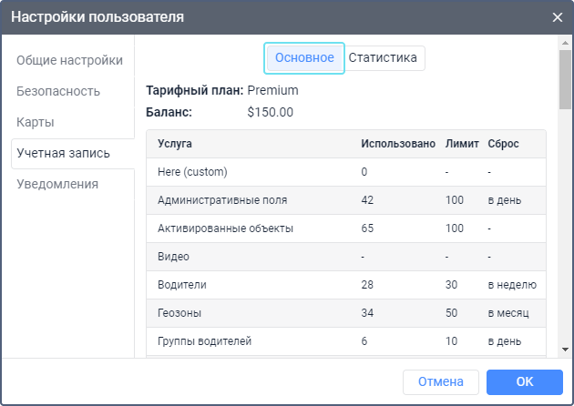 На вкладке Учетная запись настроек пользователя находятся разделы Основное и Статистика. Для переключения между ними используйте кнопки в верхней части вкладки.