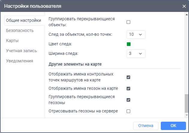 В этом разделе содержатся настройки, которые влияют на то, как показываются на карте контрольные точки маршрутов и геозоны.